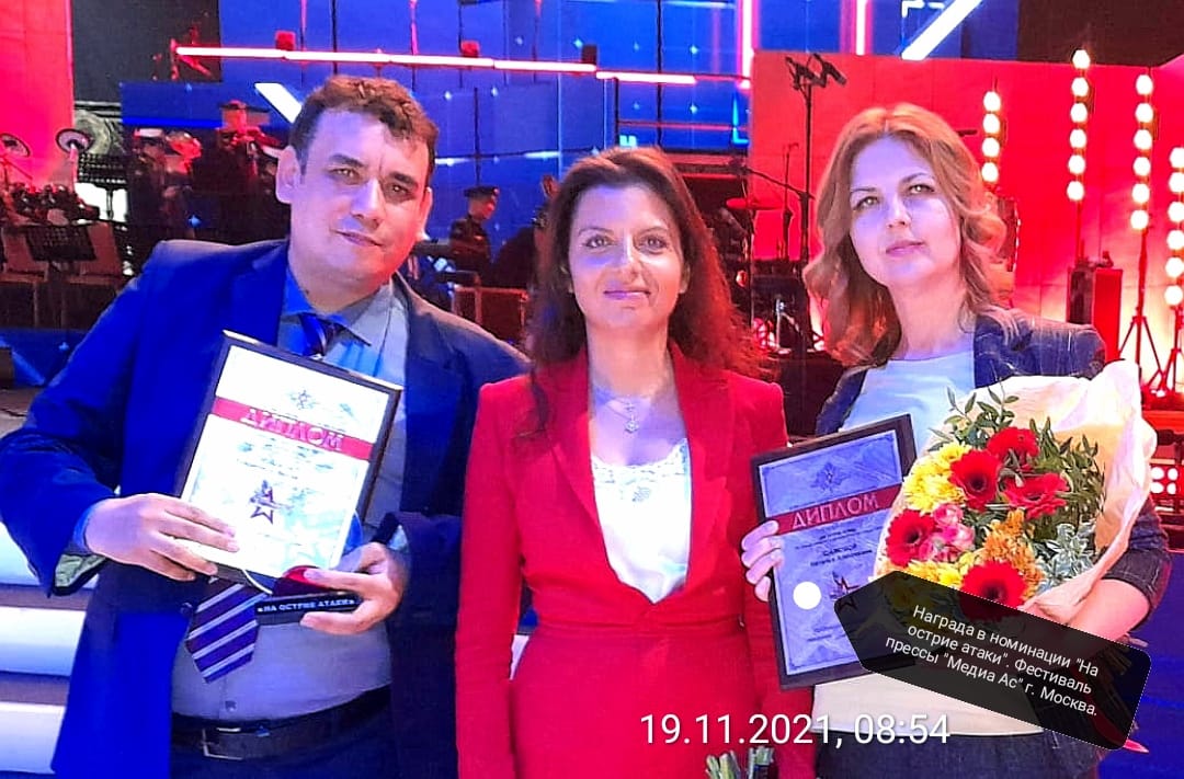Именной диплом за подписью министра обороны Российской Федерации Сергея Шойгу журналисту вручила главный редактор телеканала Russia Today Маргарита Симоньян.