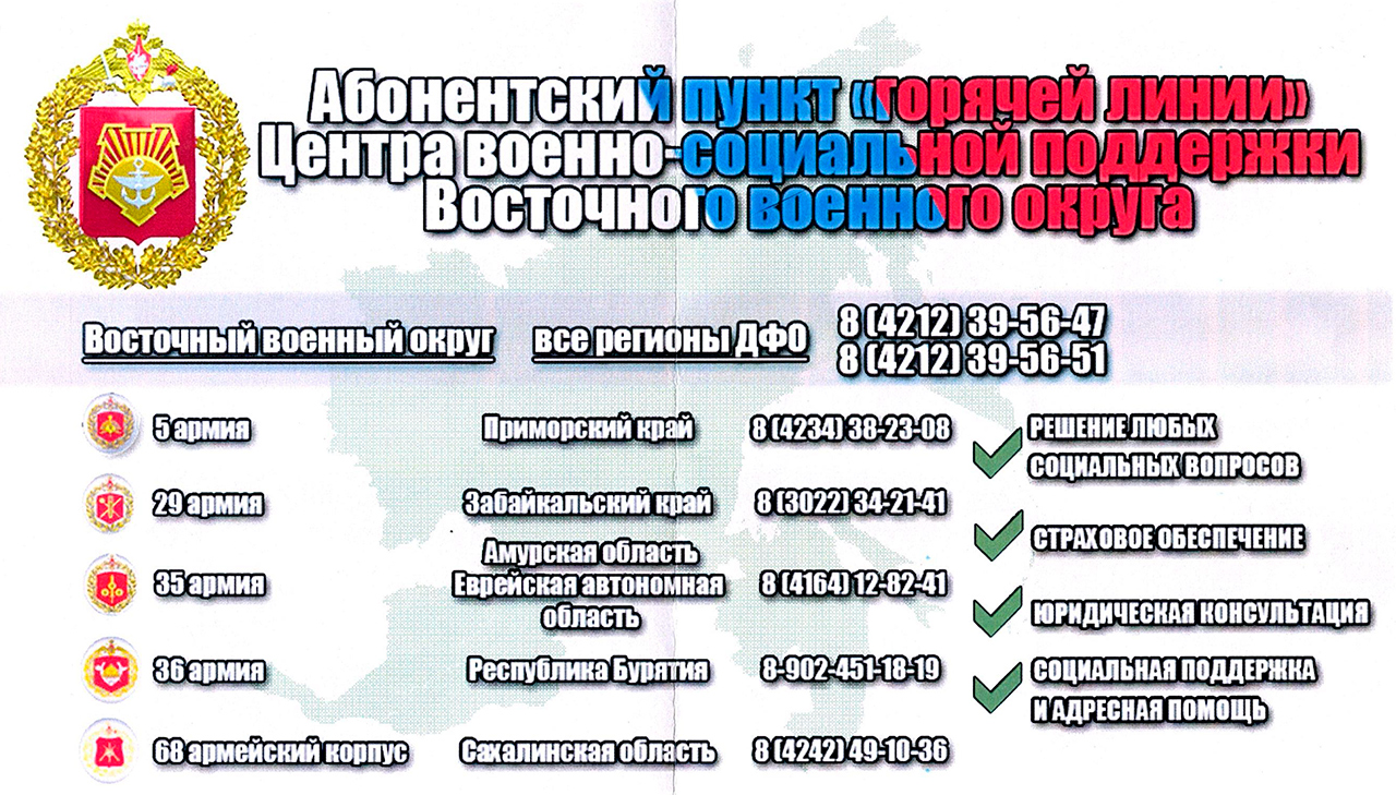 Контактная информация: Войсковая часть 01390 (Забайкальский край): 8 (3022) 34-21-41. Номера горячих линий 29-й армии ВВО, а также других воинских частей ДФО доступны по ссылке.