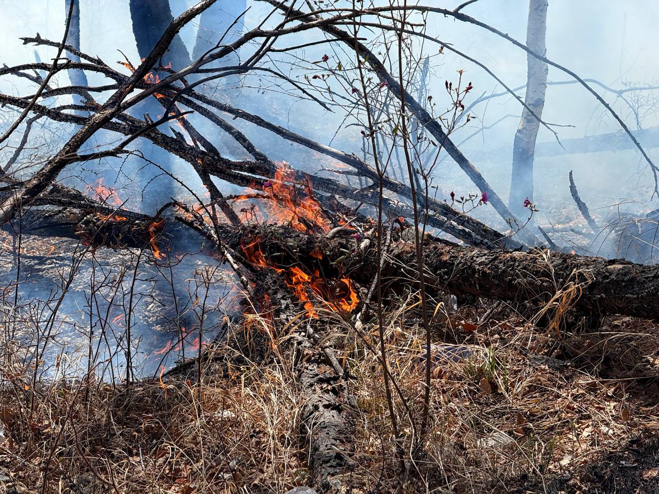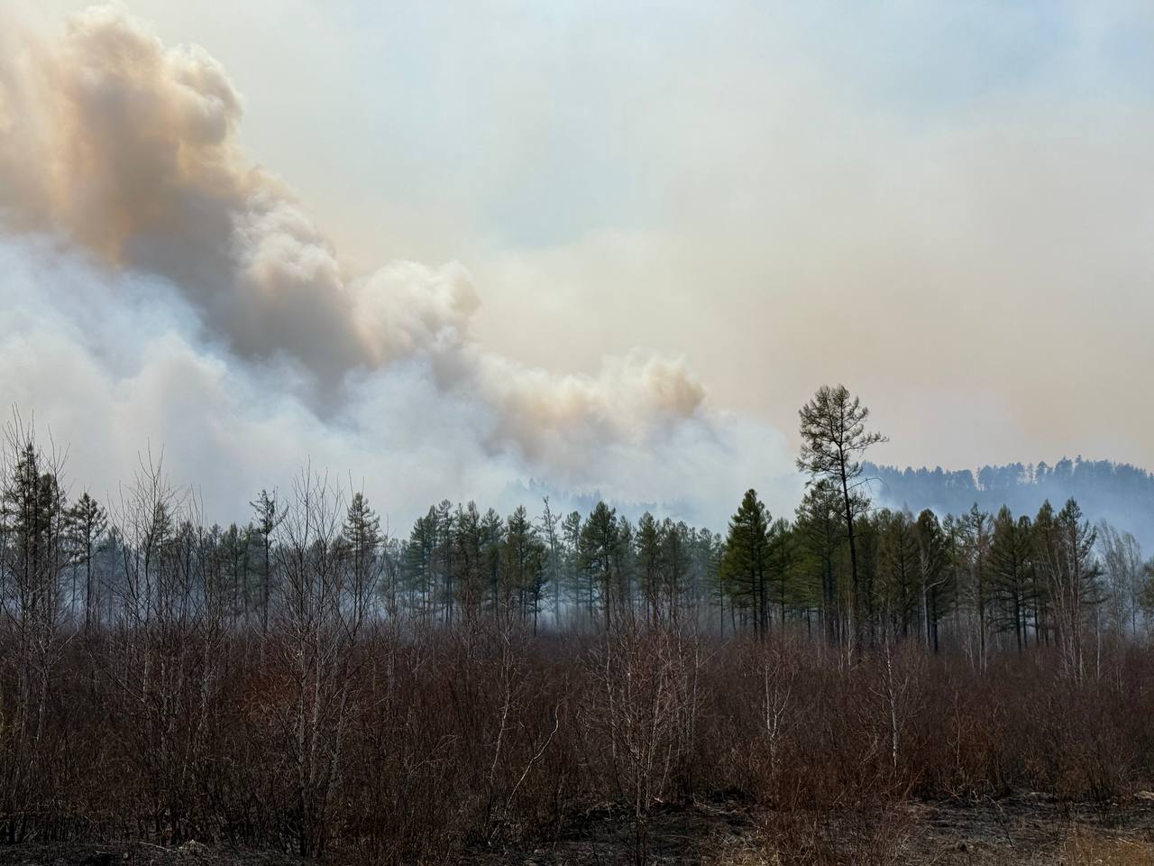 «Загнали АЦ (Пожарная автоцистерна) в лес, пытаемся поймать и удержать пожар «руками», до головы осталось около 200–250 метров. Трактор начал опашку — прокладывает минерализованную полосу в сопку. Склон не очень крутой, всё происходит по плану», — рассказал главе региона начальник Оленгуйского участка КГСАУ «Забайкаллесхоз» Яков Чертаков.