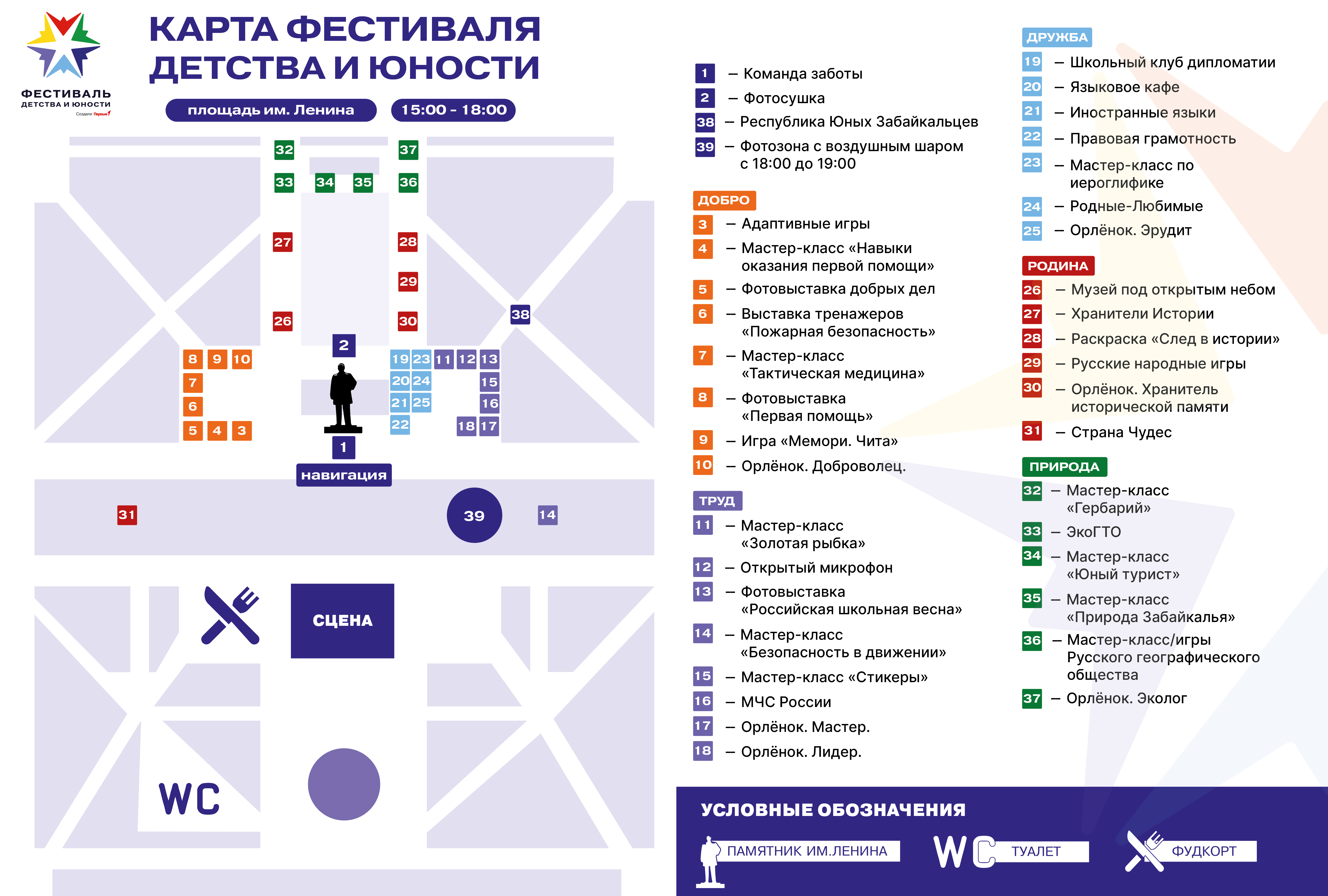 Фестиваль станет главной площадкой детства для всего Забайкальского края страны. Здесь дети и взрослые увидят реальные возможности для молодёжи в Забайкалье, познакомятся с ценностями Движения Первых. Специально для гостей в городе Чита на фестивале будут работать фестивальный городок с полезными мастер-классами и аниматорами, спортивные площадки, программа по образовательным, научно-популярным, творческим, патриотическим и иным направлениям.