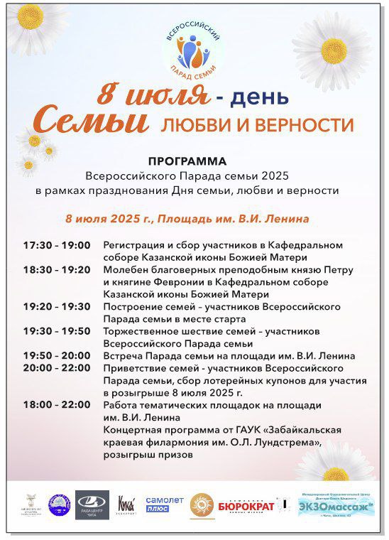 8 июля, в День семьи, любви и верности, в Забайкальском крае состоится Всероссийский Парад семьи. Праздничные мероприятия пройдут в Чите и муниципальных округах региона.