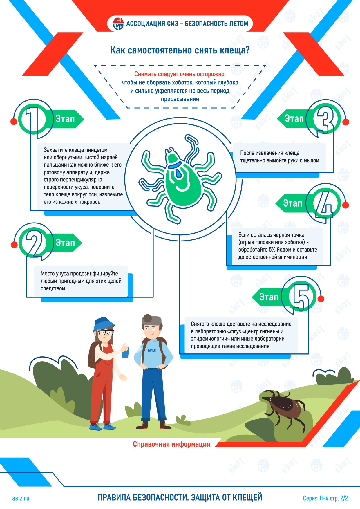Заражение происходит при укусе инфицированного клеща в лесах, парках, на дачных участках, а также при употреблении сырого молока от заражённых животных. Экспертами Ассоциации «СИЗ» подготовлена серия инфографик, содержащая общие правила безопасности, с которыми каждый из нас может столкнуться в летний период, в том числе на своих дачных участках. Среди них — рекомендации по защите от клещей.
