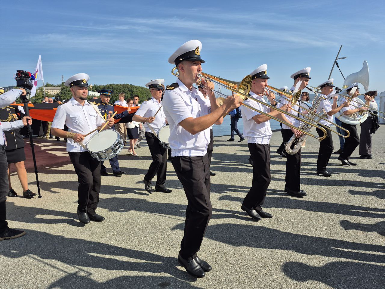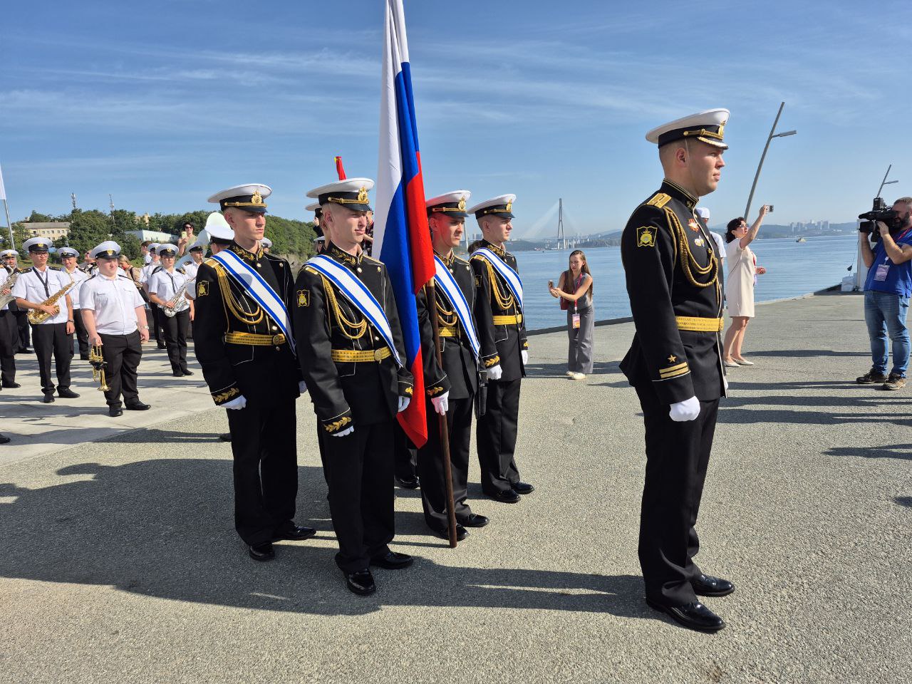 В рамках открытия «Улицы Дальнего Востока» и празднования Дня Победы над милитаристской Японией состоялось торжественное шествие с большой Георгиевской лентой по набережной ДВФУ до главной сцены выставки. Также под аккомпанемент эстрадного оркестра МГУ им. Г.И. Невельского почетный караул Тихоокеанского высшего военно-морского училища им. С.О. Макарова внес на площадку флаг Российской Федерации и Знамя Победы.