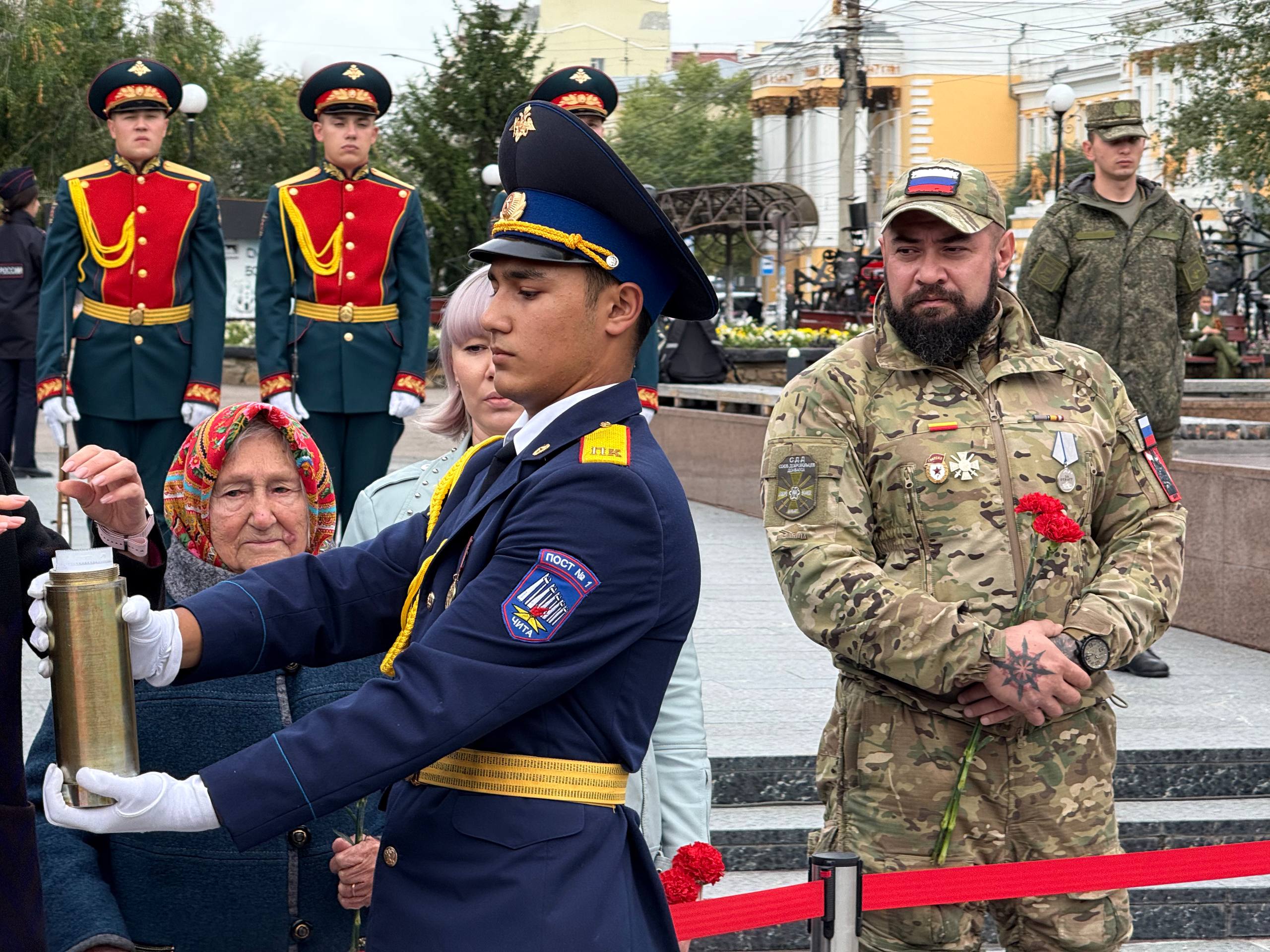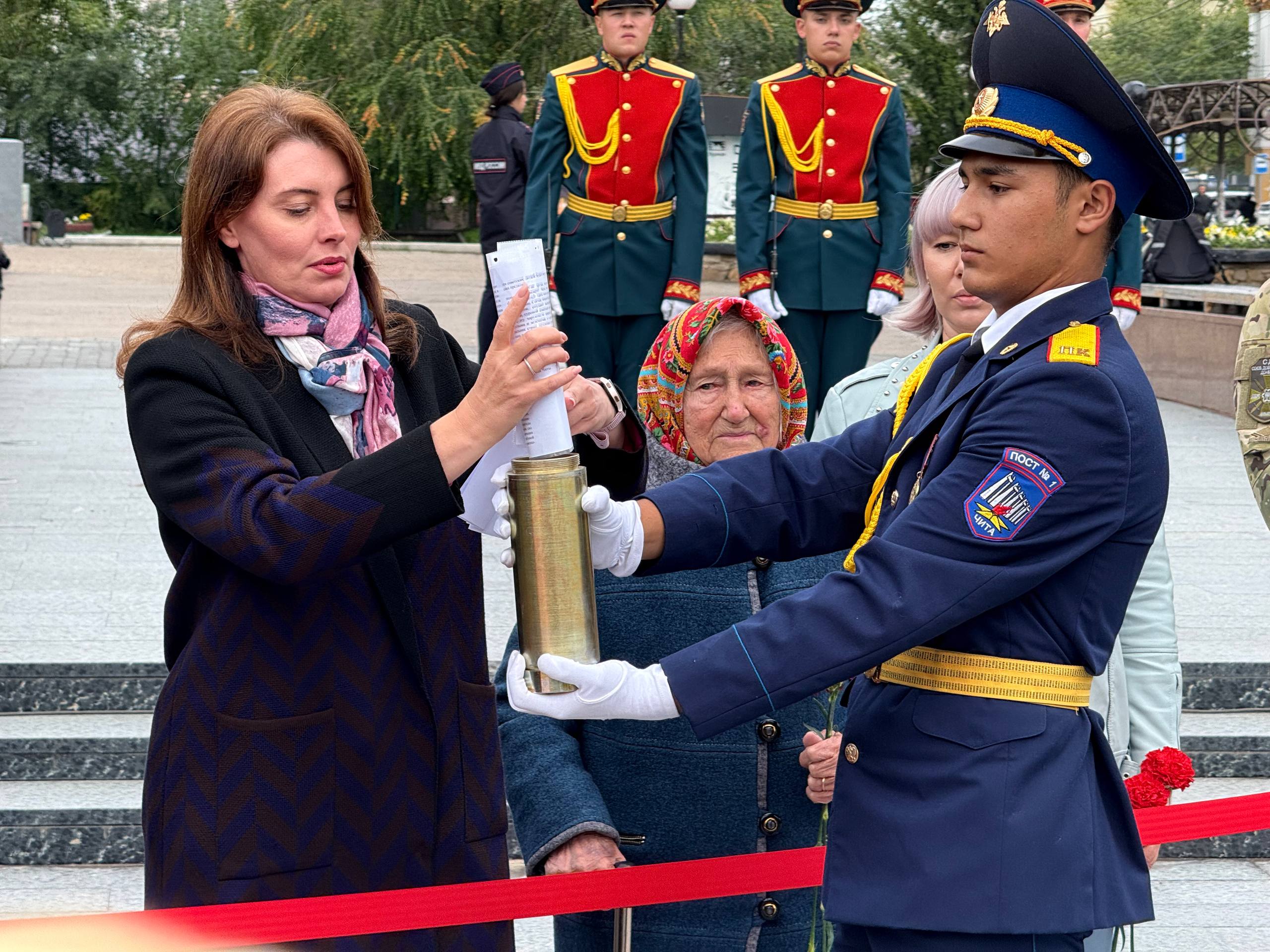 В капсуле, которую извлекут и откроют через 20 лет во время празднования 100-летия Великой Победы, были помещены послания от мэра Читы, участника СВО Евгения Бутенко, а также труженицы тыла, жительницы Читы Александры Николаевны Вологдиной, которой 19 сентября исполнится 100 лет.