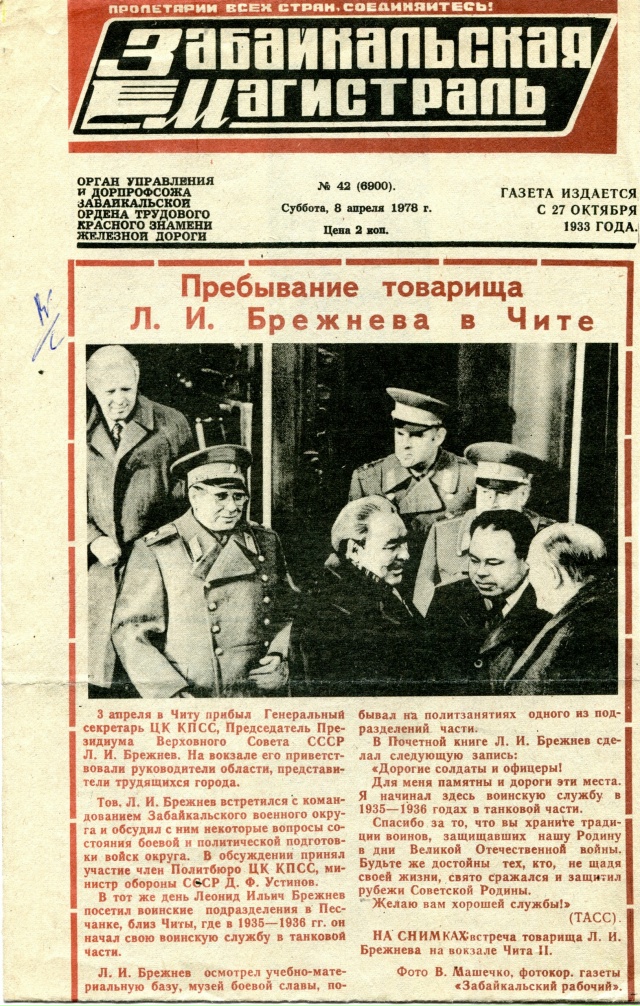 В Чите уже в статусе Генерального секретаря ЦК КПСС Леонид Ильич побывал 3 апреля 1978 года с однодневным визитом. Тогда он совершал железнодорожную поездку по Сибири и Дальнему Востоку. В рамках визита Леонид Ильич посетил штаб Забайкальского военного округа и визит в воинскую часть в Песчанке.