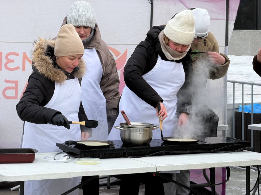 Также большое количество людей собралось для того, чтобы попробовать блины и щи. Бесплатная дегустация начнется в 13.00.