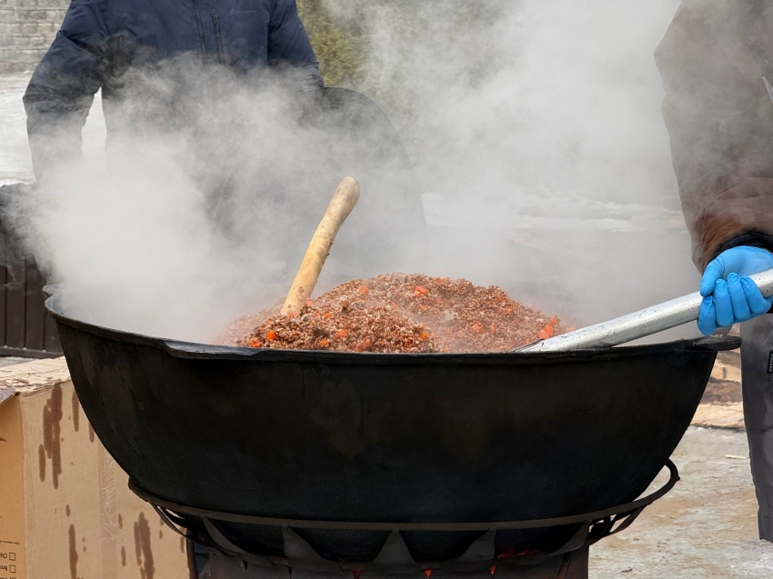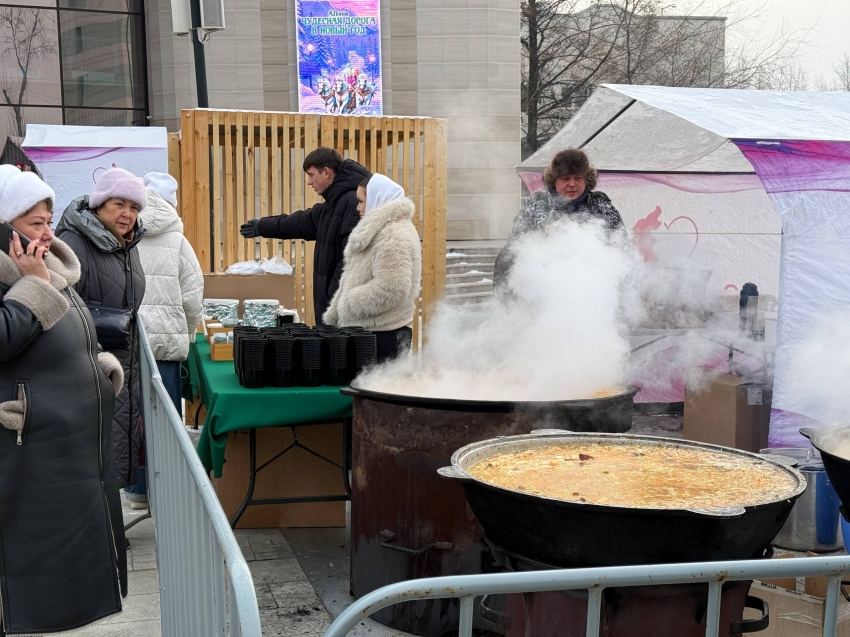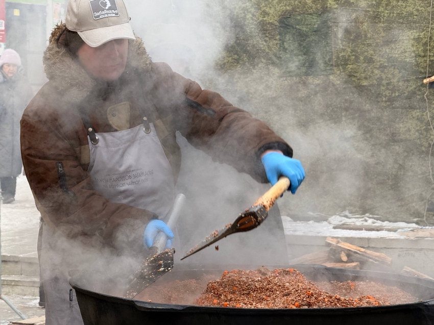 Забайкальцы и гости региона приходят на театральную площадь, где повара подготовили все для бесплатной дегустации. Одно из блюд, как называют его повара — каша из топора. Гостей привлекает торчащий из каши топор.