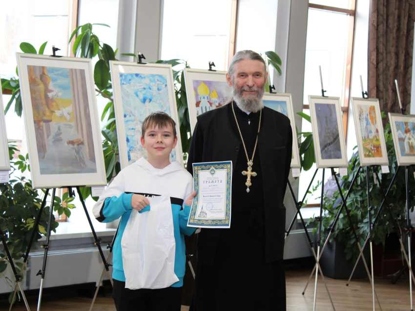 На выставке представлены лучшие работы ребят, которые приняли участие в региональном этапе конкурса детского творчества «Красота божьего мира», проводимого в рамках Международных Рождественских образовательных чтений. Их труд отметил председатель Отдела религиозного образования и катехизации Читинской епархии Русской Православной Церкви Павел Матвеев. Протоирей вручил победителям грамоты и подарки.