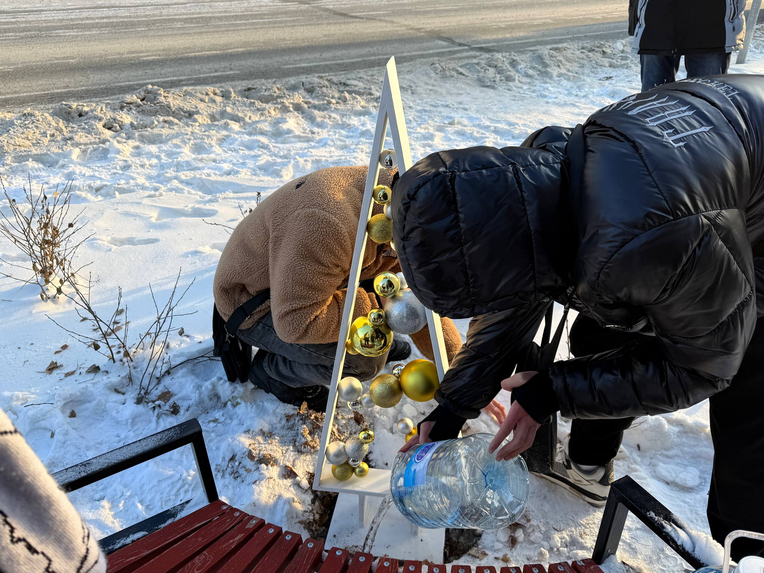 Чтобы инсталляция надёжно стояла на месте в зимнюю погоду, участники проекта применили хитрый и практичный метод: основание конструкции было закреплено с помощью воды, которая замёрзла в снегу, превратившись в прочный ледяной фундамент. Ребята с энтузиазмом работают вместе, укладывая мишурку и заливая воду — их труд уже приносит радость прохожим.