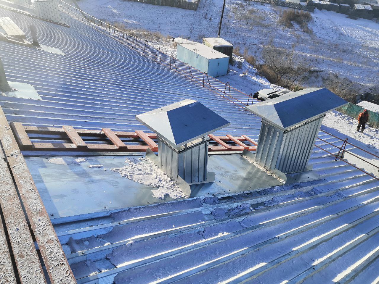 В ходе работ уложено новое кровельное покрытие стальными профилированными листами. Над вентшахтами установлены зонты из листовой стали, сделано ограждение кровель перилами, установлены элементы каркаса. Также в рамках капитального ремонта установлен противопожарный люк и лестница.