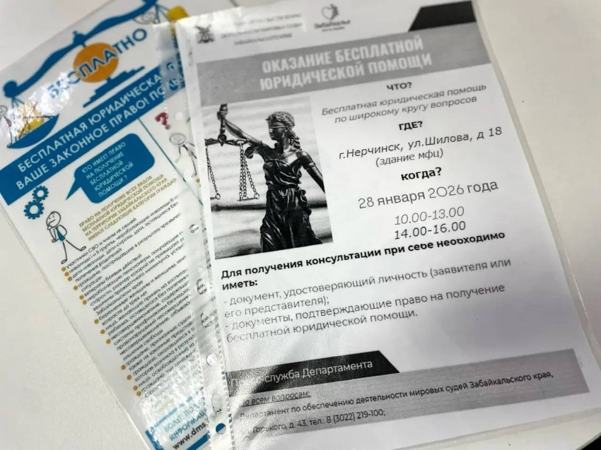 На территории Нерчинского муниципального округа Департаментом по обеспечению деятельности мировых судей Забайкальского края организована бесплатная юридическая помощь в здании МФЦ, которую оказывает ГКУ "Государственное юридическое бюро" Забайкальского края. Консультации для граждан проводит начальник юридического отдела ГКУ Денис Ханин. На данный момент зарегистрировано 7 обращений.