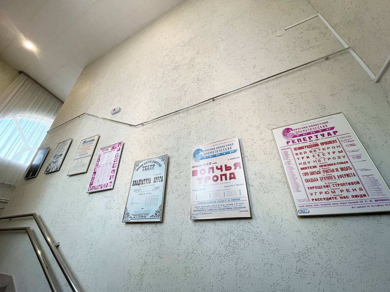 Стены вдоль лестницы, ведущей в малый зал, украсили архивными афишами тех постановок, которые уже не показывают на сцене. Среди них плакат 1963 года с представлениями «Ленинградский проспект», «Иду на грозу», «Свадьба брачного афериста» и другими.