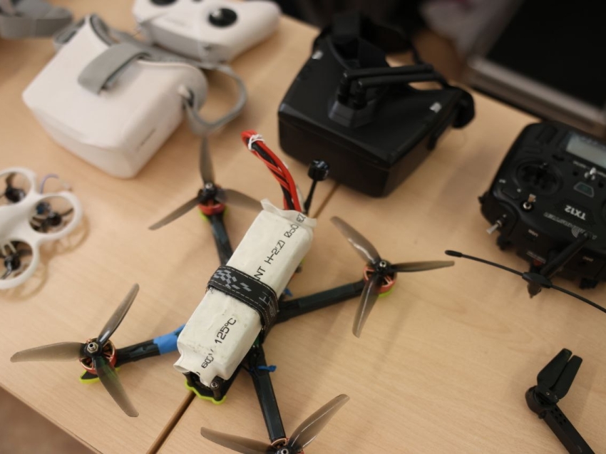 На школьных партах - разные модели беспилотников, в том числе самодельный, рации, элементы управления, FPV-очки - «глаза» оператора БПЛА, через которые сигнал с видеокамеры дрона поступает в режиме реального времени.