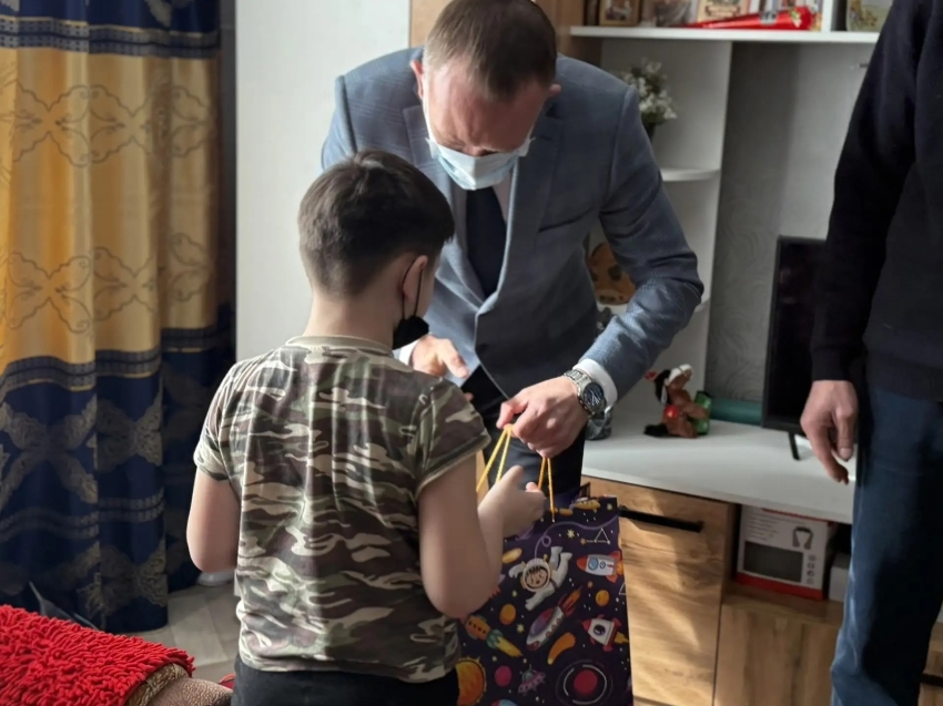Альберт Трофимов поблагодарил многодетного отца, кавалера ордена Мужества Юрия Муратова за стойкость и терпение, вручил подарки семье от правительства региона.