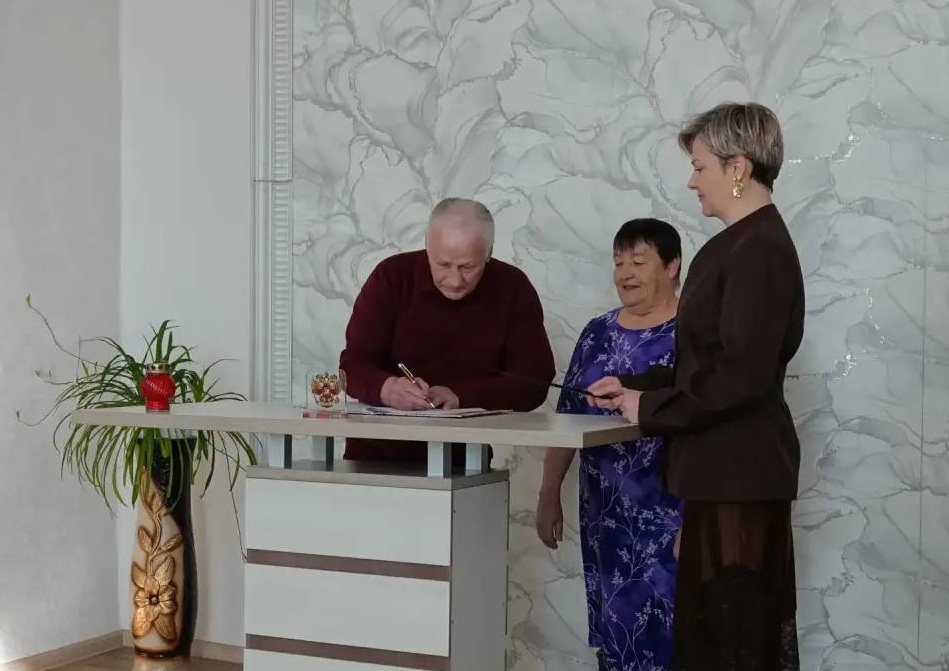 Заведующая отделом провела торжественную регистрацию брака, супруги Федорович поставили свои подписи в книге почетных юбиляров и поздравили друг друга поцелуем. Юбиляров также поздравил председатель Совета Нерчинского муниципального округа Забайкальского края, член политсовета местного отделения партии «Единая Россия» Евгений Соколов.
