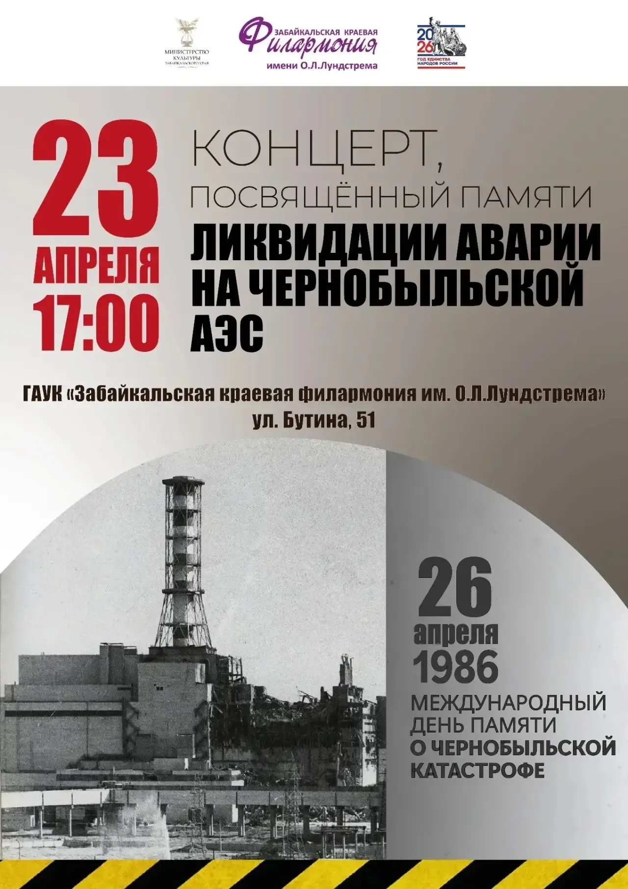 В краевой филармонии имени О.Л. Лундстрема 23 апреля в 17.00 пройдет концерт, посвященный памяти ликвидаторов аварии на Чернобыльской АЭС - самой крупной катастрофы в истории мирного атома. Концерт станет частью памятной программы, которая проходит в Забайкалье на этой неделе. Мероприятие, посвященное юбилейной дате - 40 лет со дня катастрофы, пройдет по адресу: Чита, улица Бутина, 51.